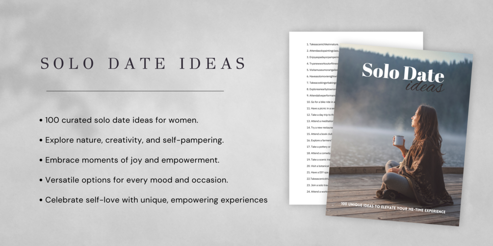 Elevate your solo moments with our digital product—100 thoughtfully curated solo date ideas. From adventures to moments of tranquility, discover a diverse collection designed to inspire joy, self-discovery, and empowerment. Embrace the beauty of your own company and make every solo experience uniquely yours. Download now It's FREE and embark on a journey of personal celebration.